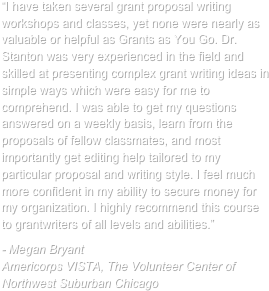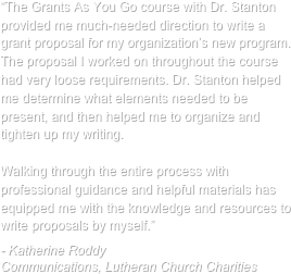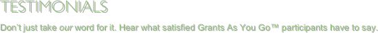 Grants As You Go™ is an affordable, online coaching experience for not-for-profit organizations desiring to increase their grant writing effectiveness.