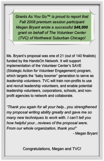 Grants As You Go™ takes you from concept to completed grant application.  You identify the project and the funder, and we coach you through the process. What could be easier?